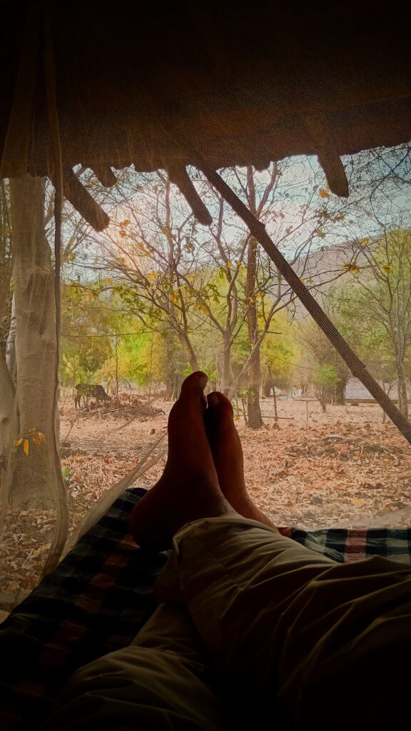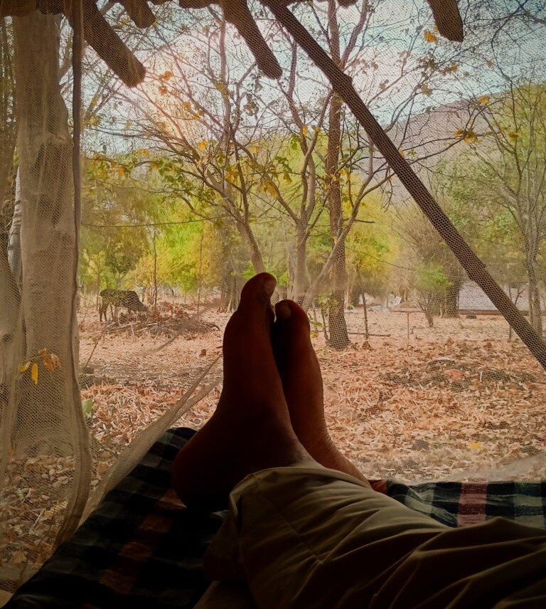 तो… बस अपनी आंखों से पक्षियों को सुनते हुए प्रकृति में बैठने का आनंद लें… (या हो सकता है कि किसी तेंदुए की दहाड़, अगर आपकी किस्मत अच्छी हो) अपनी त्वचा से ताजी जंगली हवा को देखने का आनंद लें… (खैर कभी-कभी मौत की तरह ठंडी और नरक की तरह गर्म… लेकिन यकीनन ताजी होगी…) अपने हाथों से पेड़ों से बात करने का आनंद लें… (आप उनमें से कुछ पौधे भी लगा सकते हैं…) हरी घास पर गायों के साथ सोने का आनंद लें… (खैर वहां पहले से ही सांप सो रहा हो सकता है…) या आप मिट्टी के घरों में से किसी एक में अपने लैपटॉप पर काम करने का भी आनंद ले सकते हैं… (बहुत खराब इंटरनेट नेटवर्क के साथ…) या आप ध्यान कर सकते हैं, गिटार बजा सकते हैं, अलाव के पास बैठ सकते हैं, अगर कोई उपलब्ध हो तो गपशप कर सकते हैं, अगर आपको कोई दार्शनिक सुनने वाला मिल जाए तो दर्शन बघार सकते हैं, अगर आपको पहले से ही योग आता है तो योग कर सकते हैं, आदि..आदि… या कुछ नया सीखें.. अगर आप कुछ नहीं जानते हैं…. या बस कुछ न करें… बस खाएं, सोएं… दोहराएं…. (F#@# off the World… माफ़ करना… ऐसा ओशो ने कहा था)
